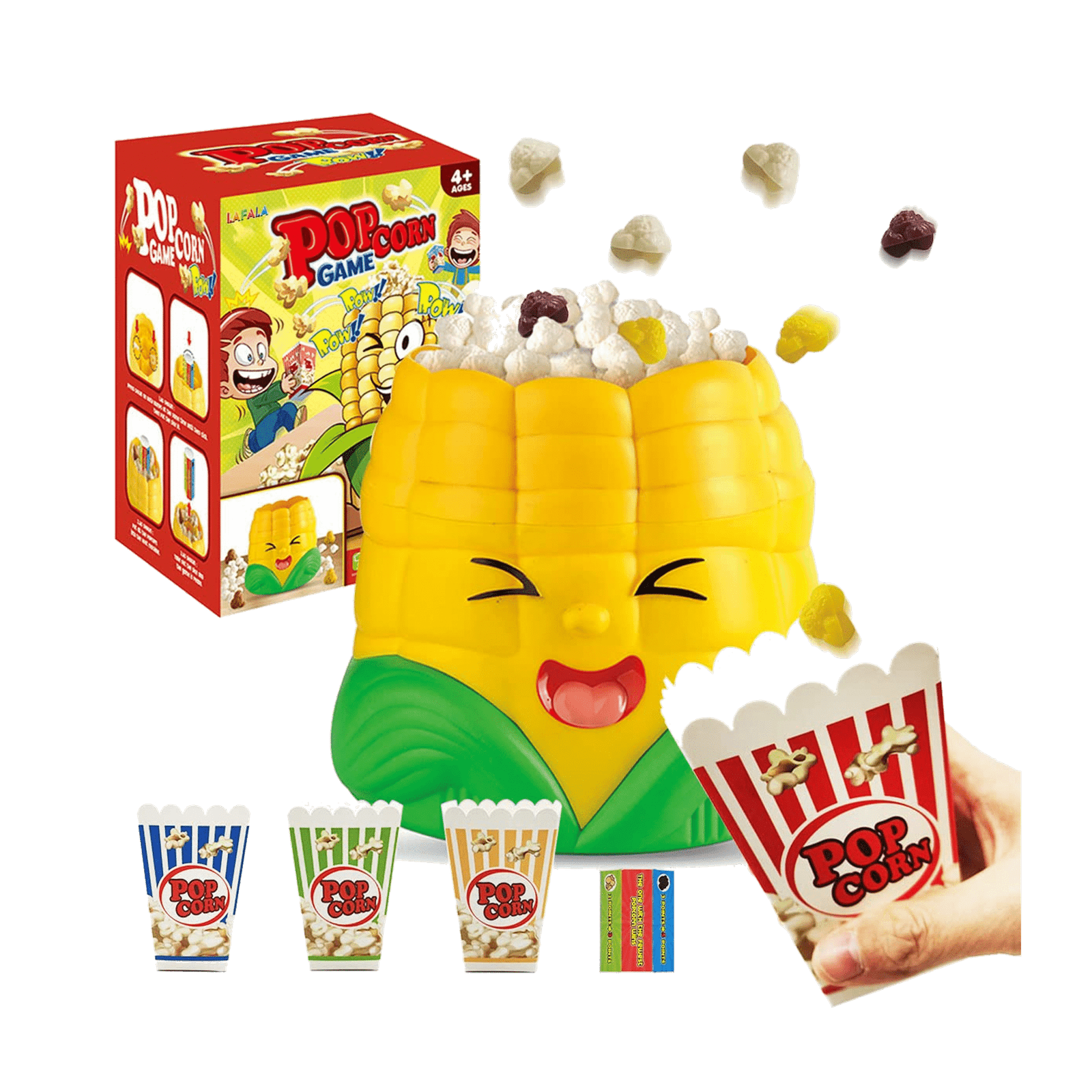 Players take turns drawing cards and pressing the corn’s button. But watch out… at any moment, the popcorn will explode into the air! Be the first to catch the flying pieces or complete your card’s mission to win!